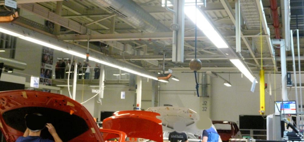 More than 300 StarConnex supply posts are mounted hanging alongside the assembly lines. The positioning of the supply lines overhead leaves the floor space free from cables and hoses. The different colour-coding of the supply posts indicates important fittings such as emergency stop button or pressurized air connections.